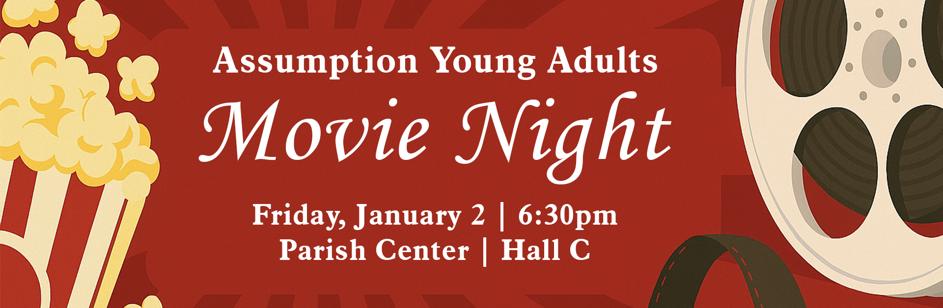 If you're a young adult aged 18-35, start the new year with friends, popcorn, and a great film! Join other young adults from the parish and the surrounding area for a relaxed evening of community and conversation at our inaugural Movie Night, Friday, Jan 2 at 6:30PM in the Assumption Parish Center, Hall C.