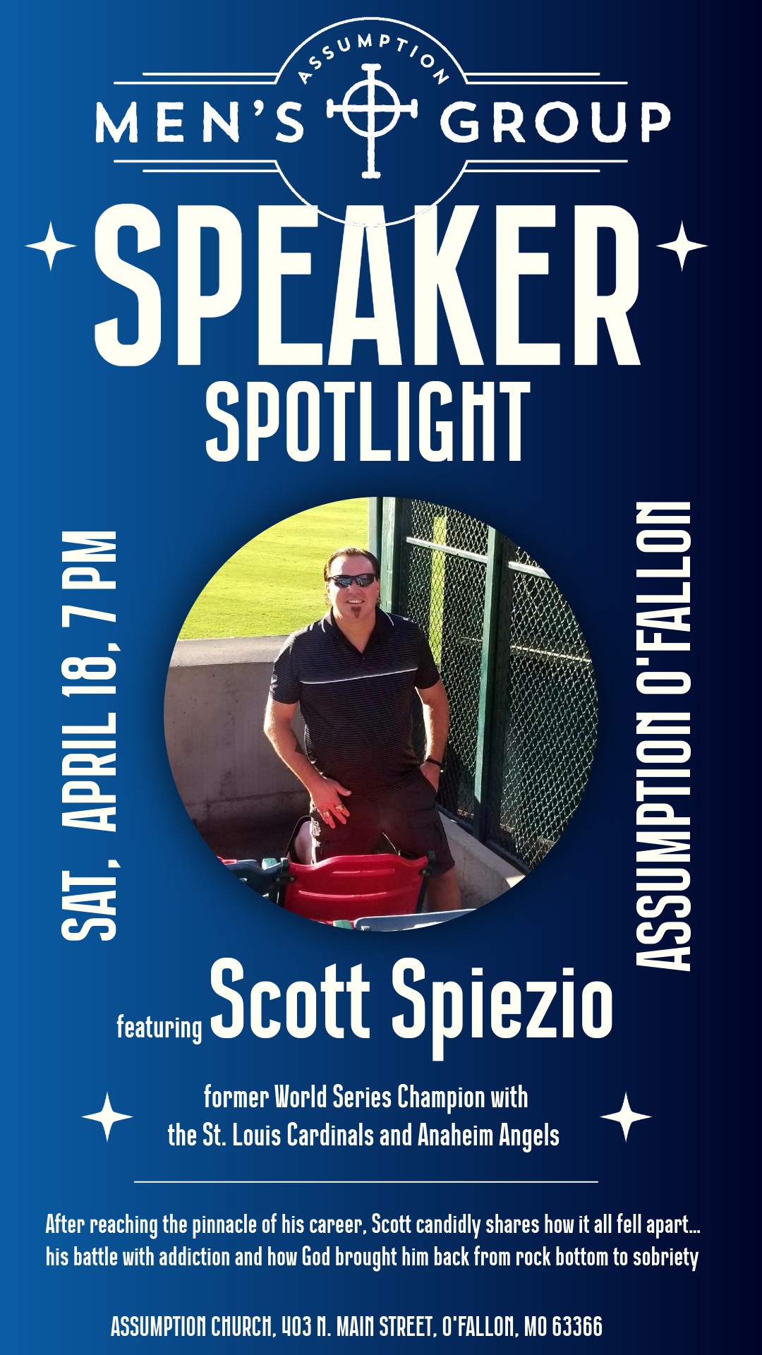 Join the Assumption Men’s Group for an unforgettable evening with Scott Spiezio, former World Series Champion with the St. Louis Cardinals and Anaheim Angels, April 18 at 7PM in Assumption Church.