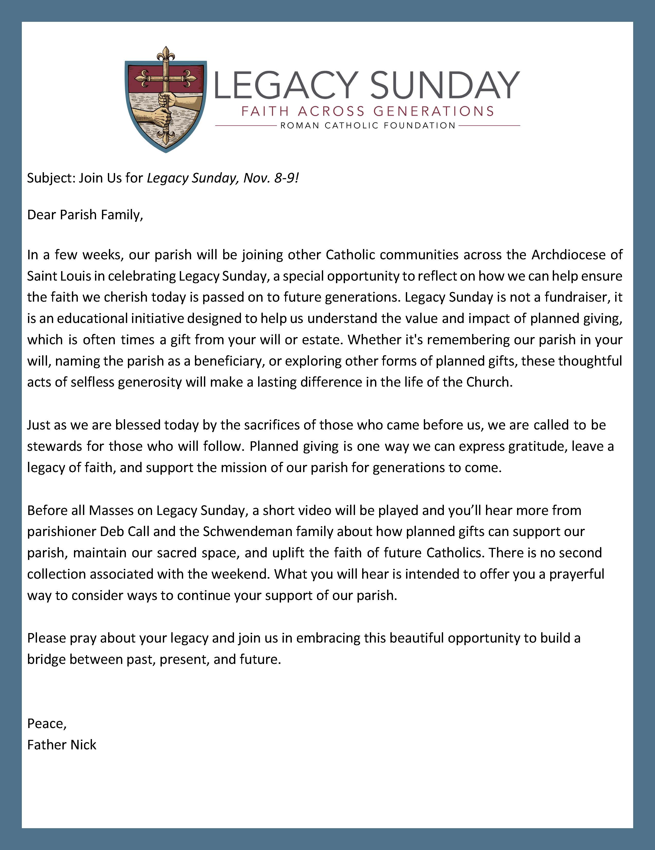 Legacy Sunday, Nov. 8-9